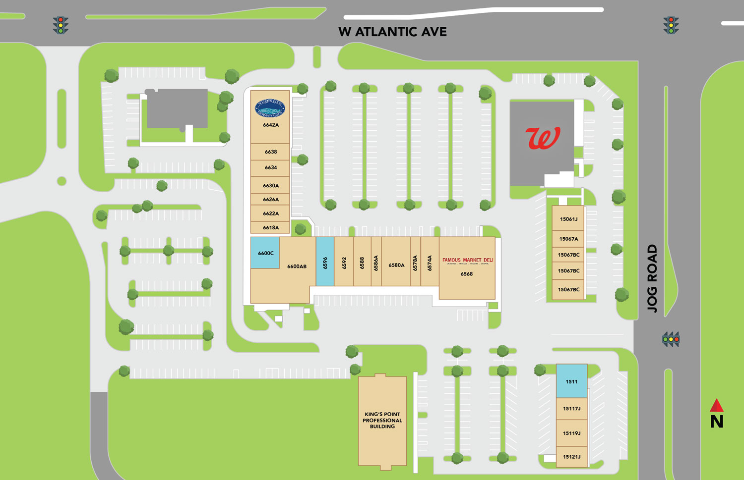 Featured tenants include Famous Deli, Waters Edge Dermatology and Delray Medical.
