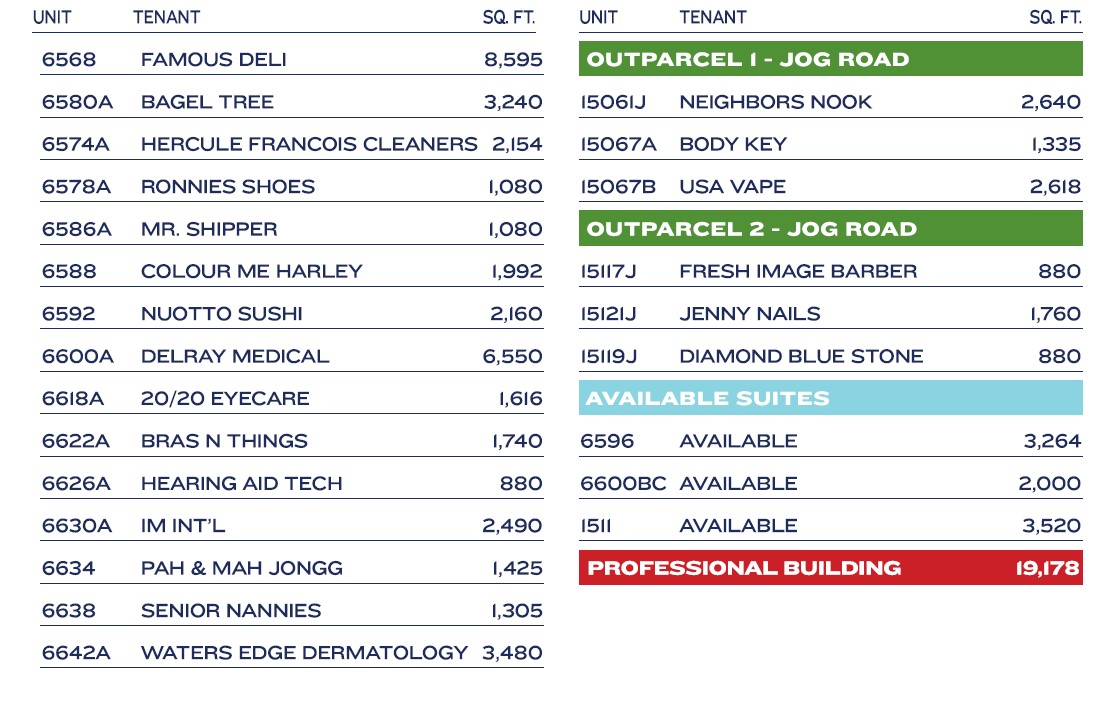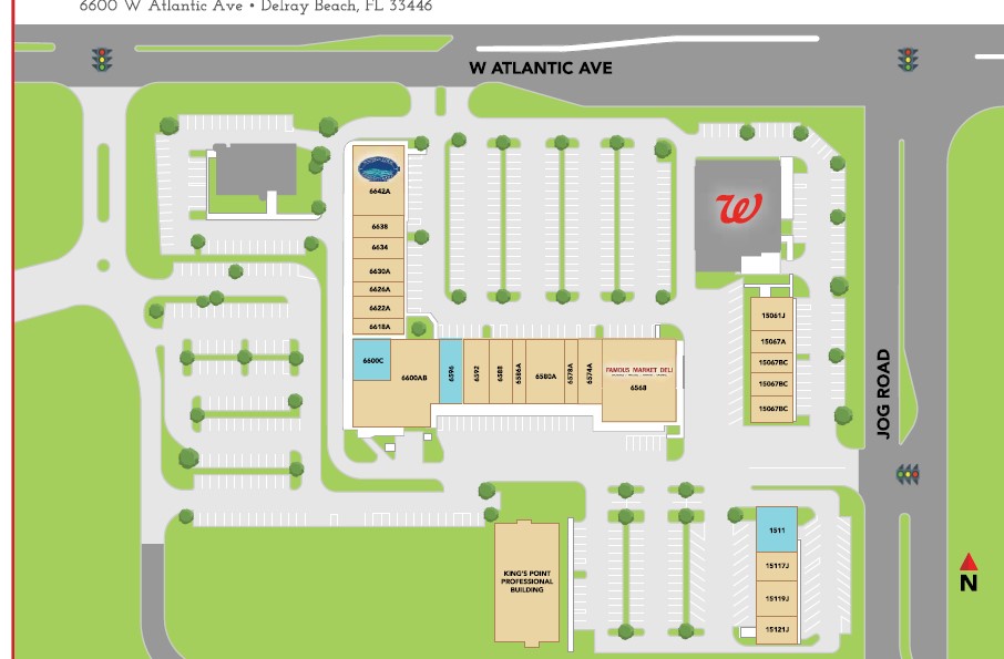 Featured tenants include Famous Deli, Waters Edge Dermatology and Delray Medical.